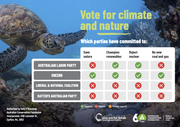 Our goal: To seize this crucial election period, when candidates are actively engaging with communities, to highlight the urgency of strong conservation policies. Through actions and events we sent a clear message: Far North Queenslanders care deeply about where candidates and their parties stand on energy, biodiversity, and climate action.